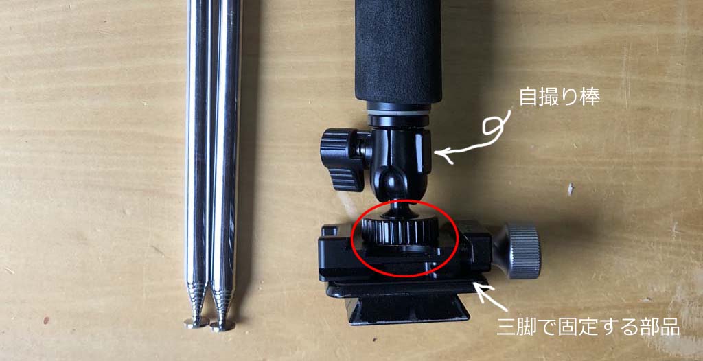 50MHzダイポールアンテナを自作して移動運用で使い始めたら、アンテナ設置をもう少し上手くできないかと思うようになった。問題は、ロッドアンテナを水平からバンザイタイプに角度を設けた時にそれを保持するプレートを追加したが、それが保持されないためロッドアンテナの位置(角度)が決まらない事がある。又、高さを上げるために自撮り棒を上下逆さで使っている事で三脚と自撮り棒の取付ネジの噛み合い代が少なくかつネジが入りずらい。(下記写真の赤丸部)