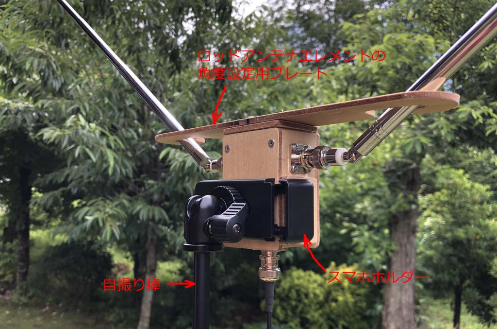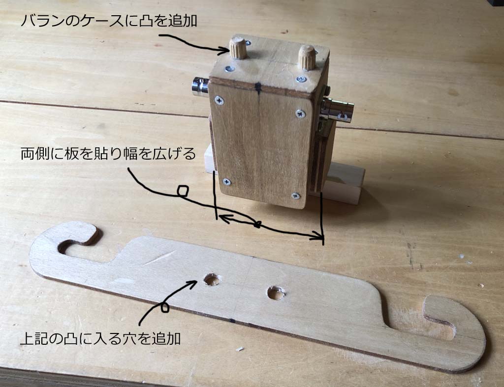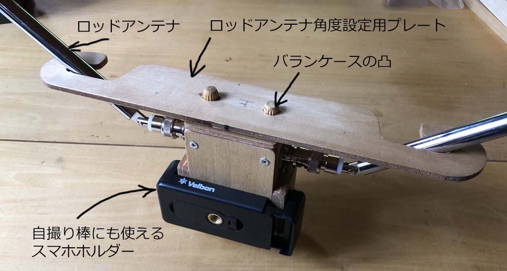 ロッドアンテナは水平になろうと下方向に荷重が加わるので、ロッドを保持した時に左右のロッドのバランスが崩れると、プレートが動いて左右のロッドアンテナの角度がズレていたのを、プレートの位置決めを設けて防いでみた。スマホホルダーを使えるようバランケースに木を貼り幅を調整した。