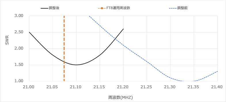 唯一21MHzはラジアルのエレメント長を調整すれば共振周波数も変化が見られたものの、最低値が1.5と使用できるバンド幅が狭い。これでは、FT8とSSBの両立が困難な結果となった。(50MHzもSWRが2以上になりダメだこりゃ。)