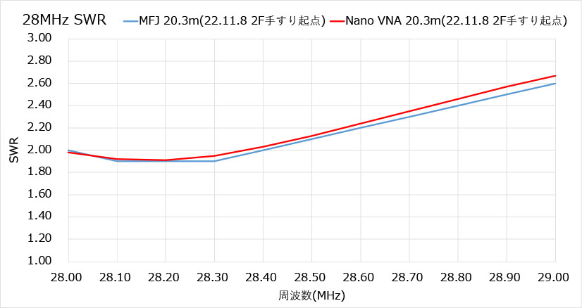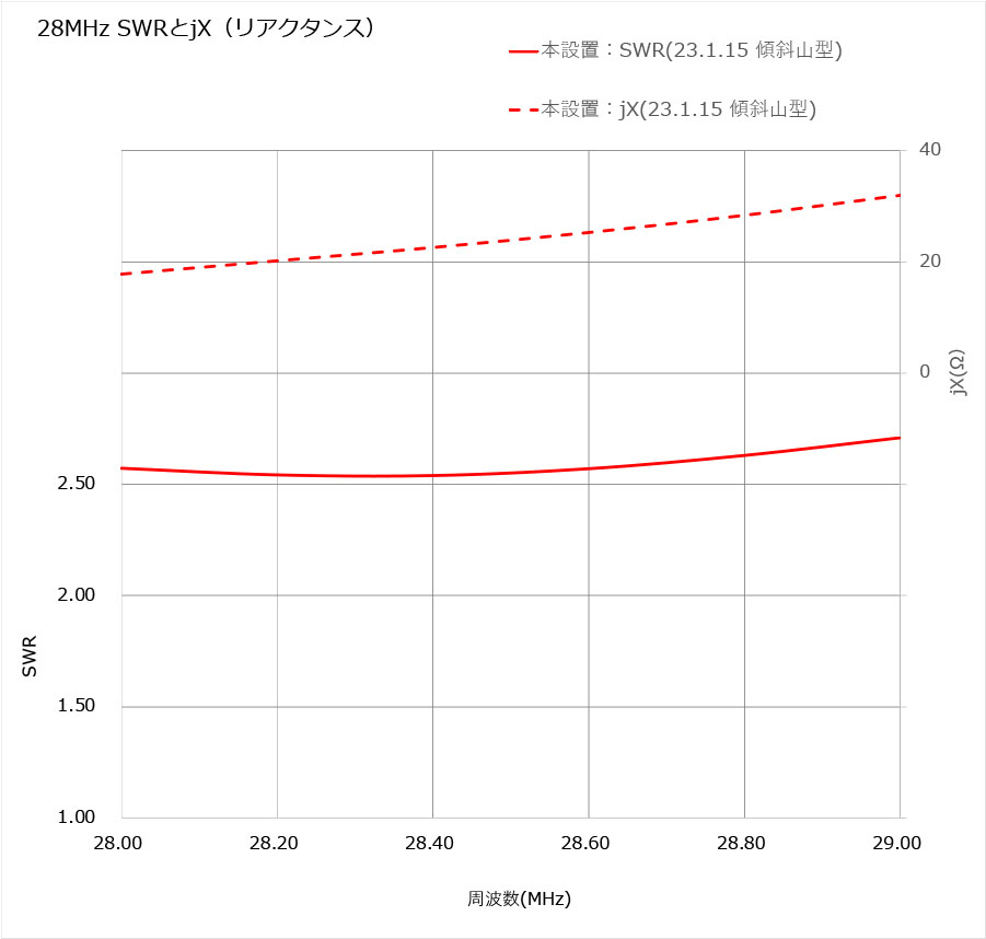 仮設置で測定したSWRの結果は、7/14/21MHzは1.5以下、28-28.4MHzで2を下回った