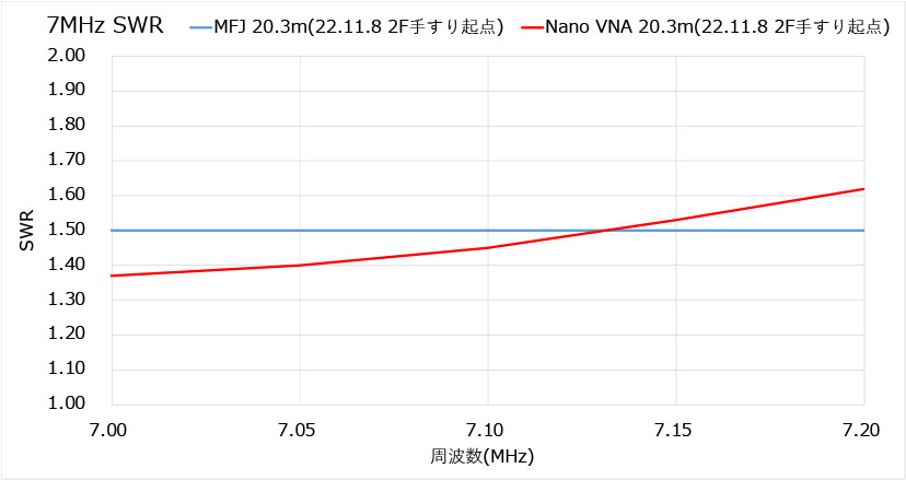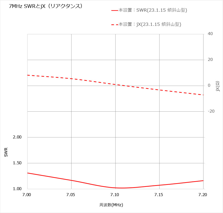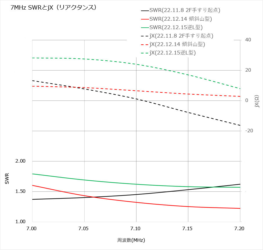 少々逆V(22.11.8 2F手すり起点)より共振周波数は上ったが、7.5MHzでSWR:1.1以下、リアクタンス:0.2Ωと期待できる値が決め手となった。