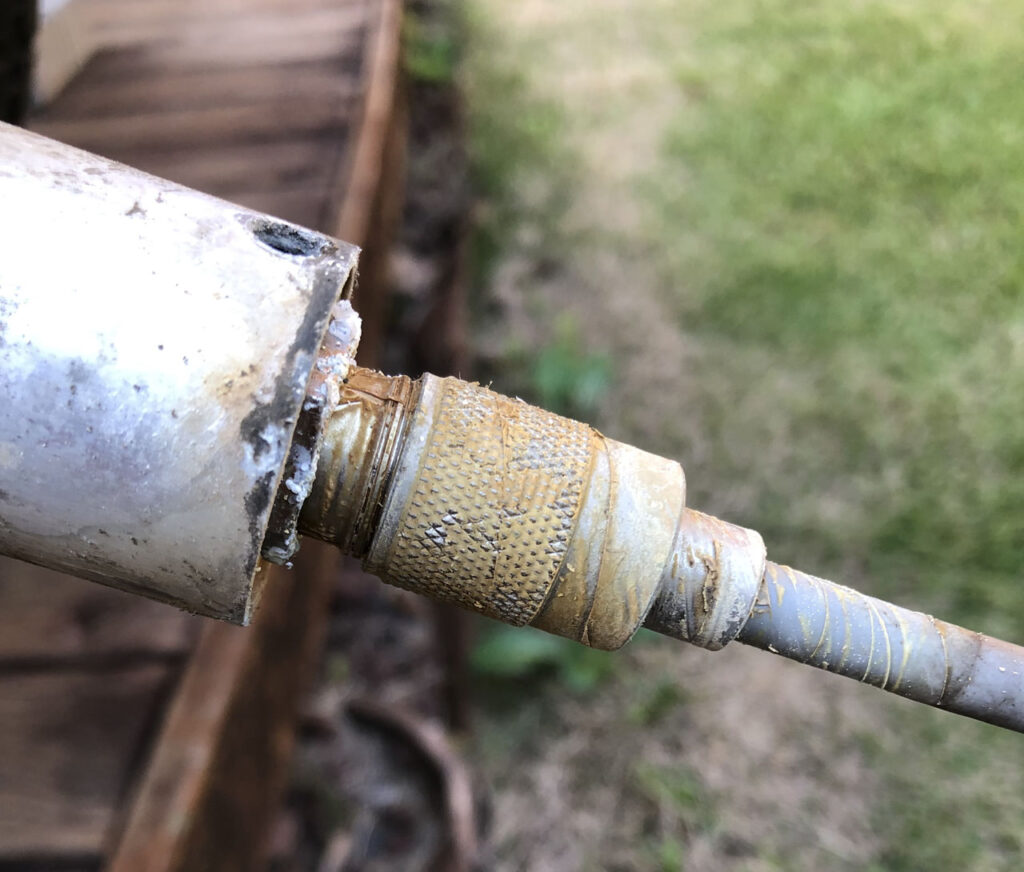 ・給電部上部のアルミパイプ内に水が溜まっていた。(写真の左ほうこうにアルミパイプが続いている。)