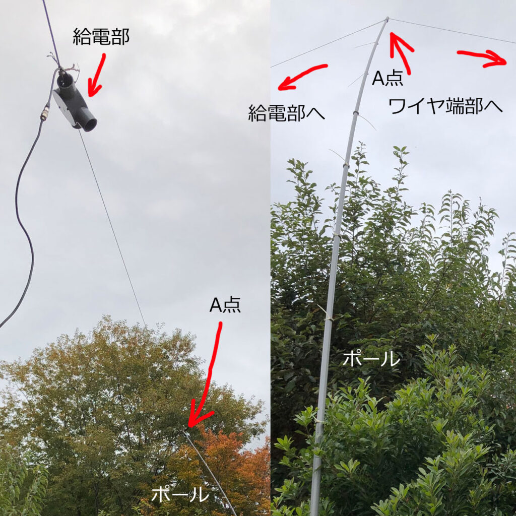 給電部の高さ6m位、伸縮ポールの高さ8m位の仮設置でSWRを確認した。(少々逆V)