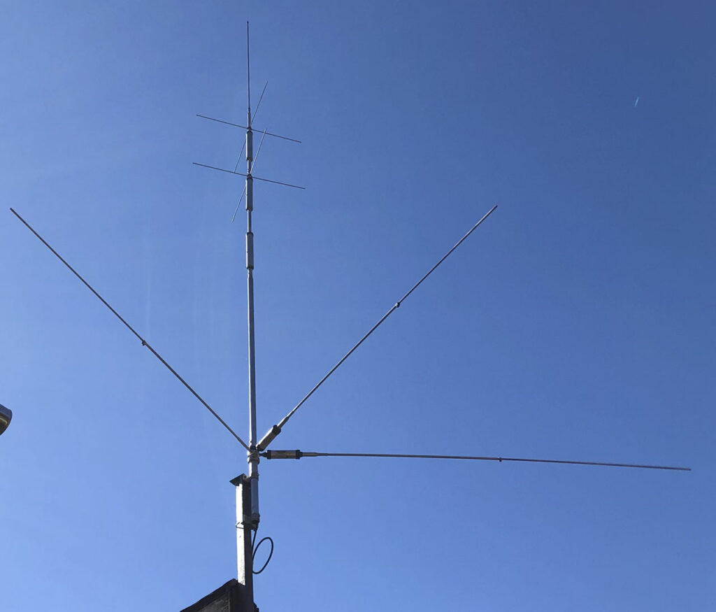 しかし、約20mのエレメントをストレートで設置できるスペースがない。(今回はお隣の空き地にはみ出した状態で設置した)我が家の土地に設置しようとするとエレメントを上から見て「への字」に曲げないと収まらない。「への字」に曲げたら放射パターンはどうなるの?それを想定して設置を考えねば。50MHzのアンテナも単独で考えねば。