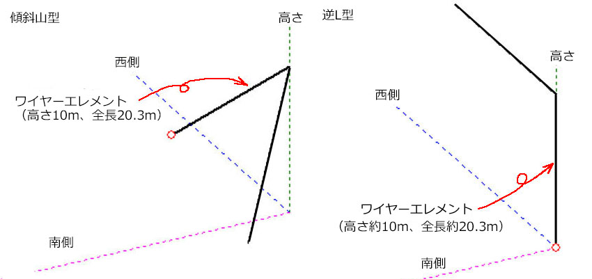 への字を諦め、「逆L型」と「傾斜山型」で仮設置を行いSWR測定を行う。結果は住宅地なので周りから見たアンテナの感じと7MHzのSWR値から「傾斜山型」にする事となった。