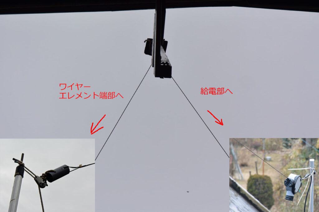 中央は屋根の部材からL型のステー(木製)に滑車を付けエレメントを折り返した。(写真は下から見た状態)エレメント端部側はタープ用の約2mアルミポール、給電部は4m伸縮アルミポール。SWRは7MHzが更に良好な結果となった。残りはどこまで電波が飛んでくれるか?そして、21MHzの共振周波数が20.8MHz前後なので使用する周波数帯にずらせないか?