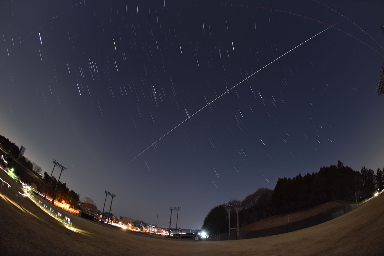 ISS(国際宇宙ステーション)撮影(2022.03.17) 山歩きとham 2022-03-18 夜の19時25分ごろから西北西方向(中央付近)から見え始め、北の上空で見えなくなった。北西方向にカメラを向け、後には月が上り月明かりの中での撮影となった。仰角が45度ぐらいと低く地上の動きも写った。 撮影モードはマニュアル、16mmフィッシュアイでf/5.6、10秒の連続撮影。その後、画像ソフトで明るさ調整、比較明合成処理を行った。