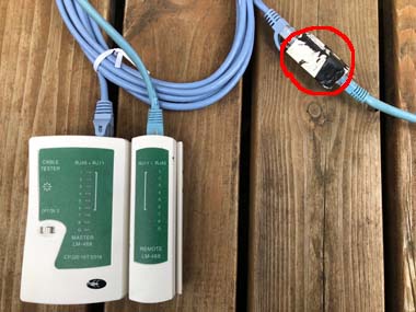 LANケーブルとケーブルを繋ぐ中間コネクターの状態でテスターを使い導通チェックNG。次に中間コネクターを外しLANケーブルのみで導通チェックしたらOK。なんと中間コネクターの不具合(赤丸)だった。