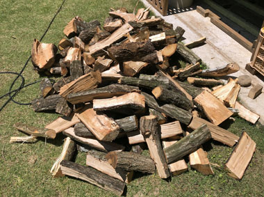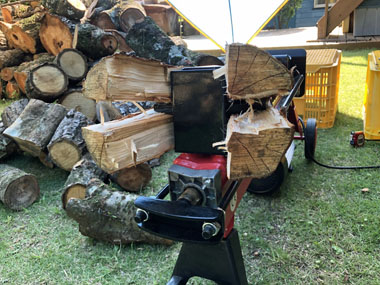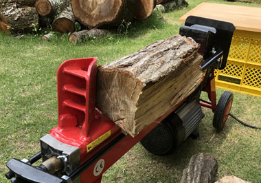 LS-7を使った薪割り 薪活とストーブ 2020-06-07 使い方を覚えるためと薪割り機にかかる負荷を軽めにして様子を見ようと、太さ:7cm〜26cmぐらい、長さ:19〜42cm(ストーブに入る長さが42cm以下)で薪割り作業を始めスムーズに進んだ。 割った状態 4分割カッターを利用 ただ、太く(太さ25cm前後)なると割れないこもあり。中心を外すと割れた場合もあるが、目的の太さ(MAX径:約50cm)を割るには新たな助っ人が必要と解った。 なぜかコーションラベルが剥がれた。