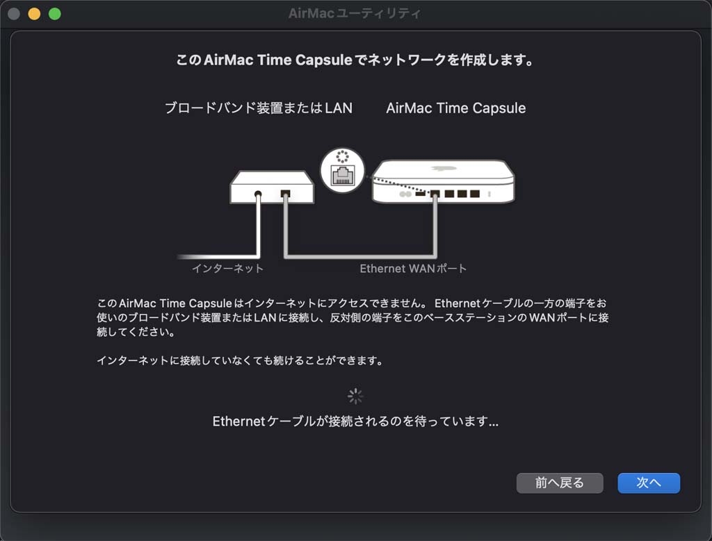 AirMacを工場出荷状態から起動すると(ケーブルを繋いでない場合だけ?)下記の説明が出る。