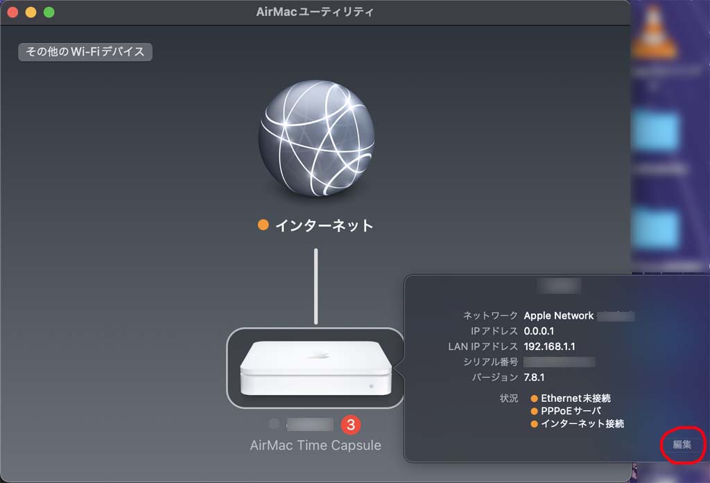 インターネットとAirMacのオレンジ色は未接続状態を示している。AirMac(絵)をクリックするとダイアログが表示されるので、右下の編集をクリックする。