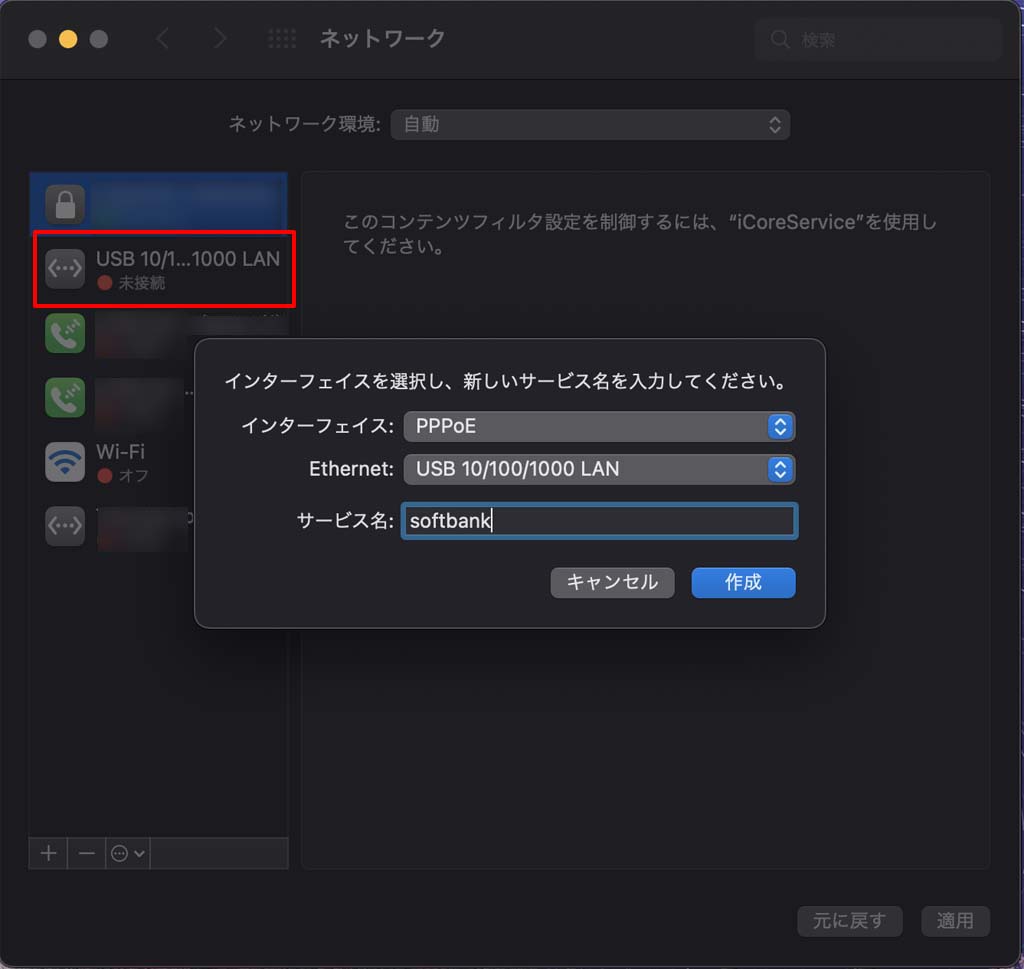 1.システム環境設定>ネットワークを開く その後、+(左下にある)をクリック