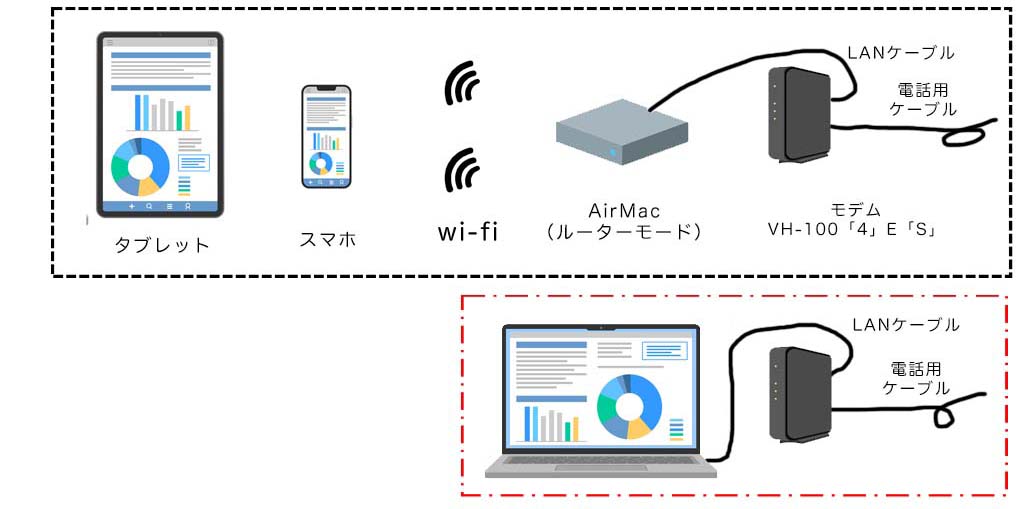 イメージは黒の点線枠で囲んだ構成で繋げたいが繋がらない。原因が解らないので構成を絞った赤枠(モデムとMacを有線LANで接続しAirMac、wi-fiの原因を含めない)から接続確認を進めた。