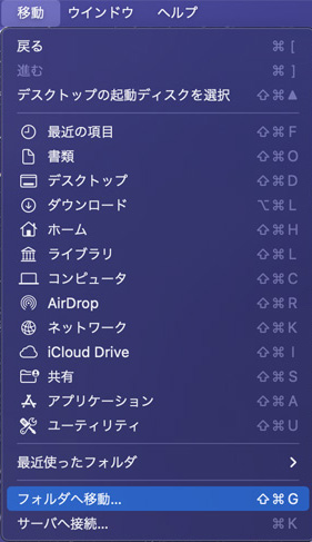 ・念のためデスクトップ上部のメニュー(Finder)から移動>フォルダへ移動を選択して確認した。
