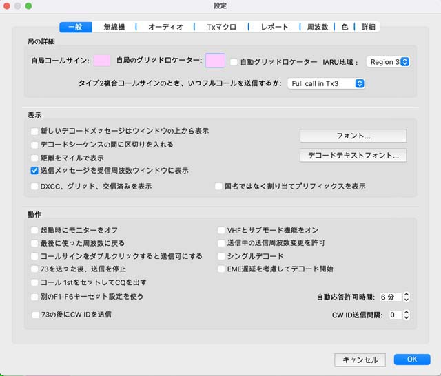 アプリを起動後、メニューのWSJX-T > 設定 を選択して設定ダイアログを表示する。