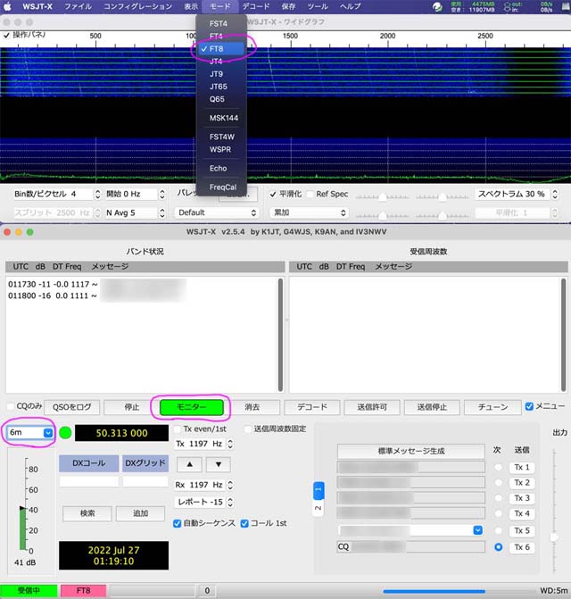 ・周波数の選択、モードからFT8選択、モニター(各丸印のところ)をクリックすると受信が始まった