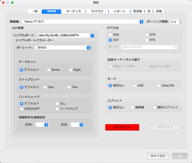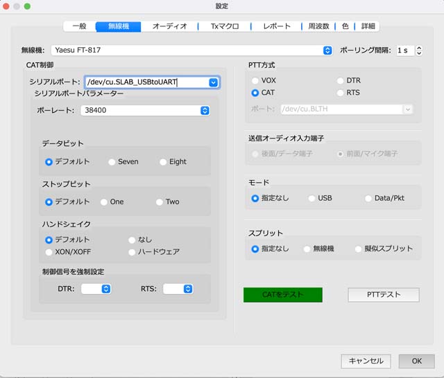 ・CAT制御 > シリアルポート:/dev/cu.SLAB_USBtoUART 選択