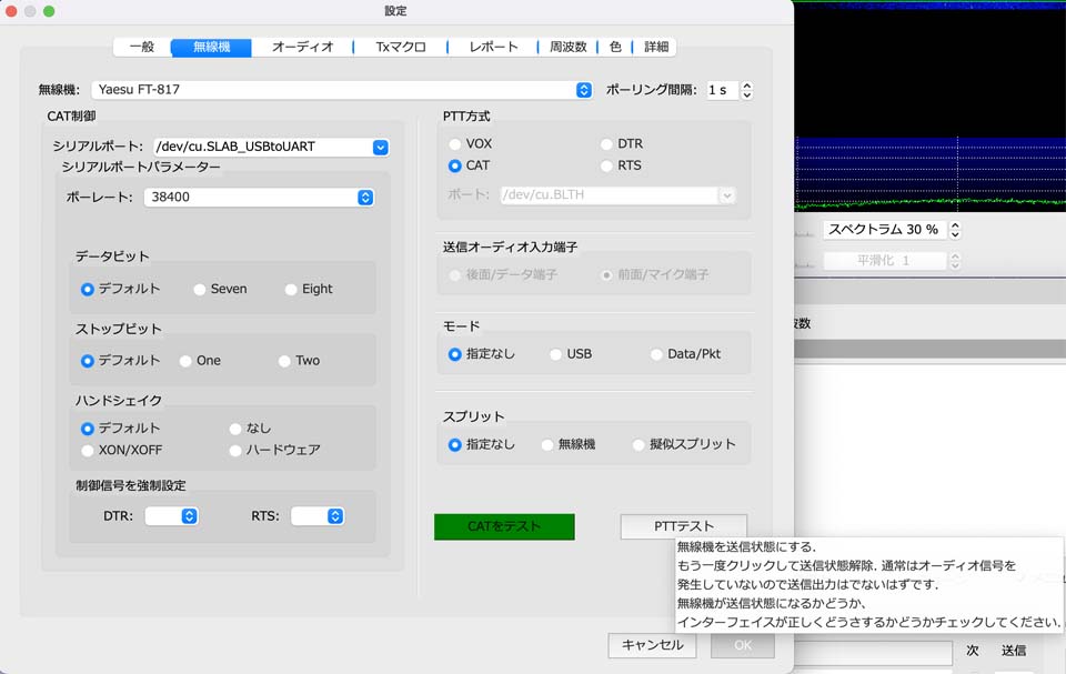 ・「PTTテスト」ボタンが赤色に変化して、FT-817は送信に切り替わったが、「CATをテスト」は緑色でOKだったためボタンの赤色が気になる。(ユーザーガイドに色の変化は記されていない。)