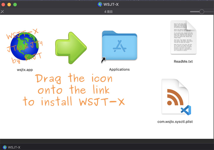 ◆ wsjtx.appは、applicationsフォルダへドラッグ