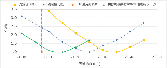 FT8で使う周波数21.074MHzではSWRが3以上と高い。調整のイメージは共振周波数を200KHzほど下げる調整を行う。