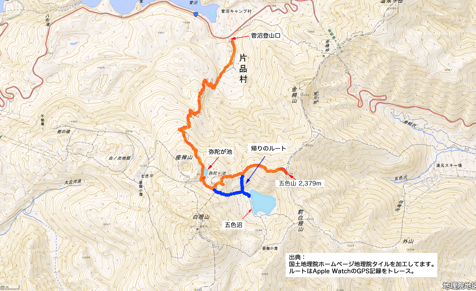 <行き:3時間25分> 菅沼登山口 08:00発 弥陀ヶ池 10:06通過 (みだがいけ) 五色山 11:25着 あ ------------------------------ 休憩・昼食:50分 ------------------------------ あ <帰り:3時間00分> 五色山 12:15発 五色沼 13:03通過 弥陀ヶ池 13:36通過 菅沼登山口 15:15着 あ ------------------------------- (途中の休憩・写真撮影含む) あ あ |