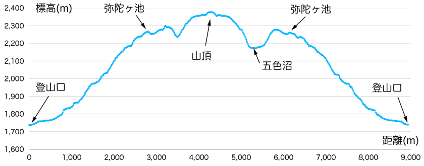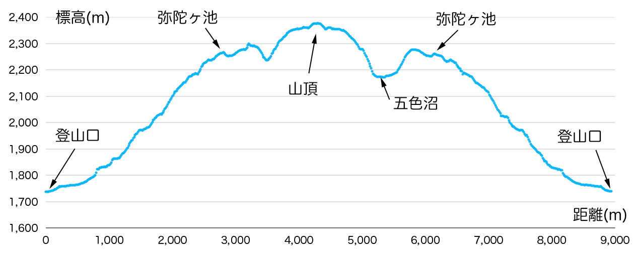五色山 2,379m 登山口 約1,730m |