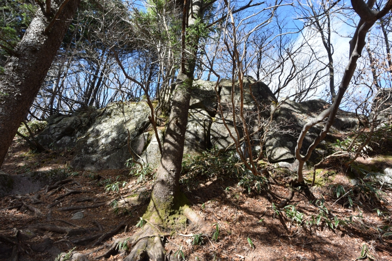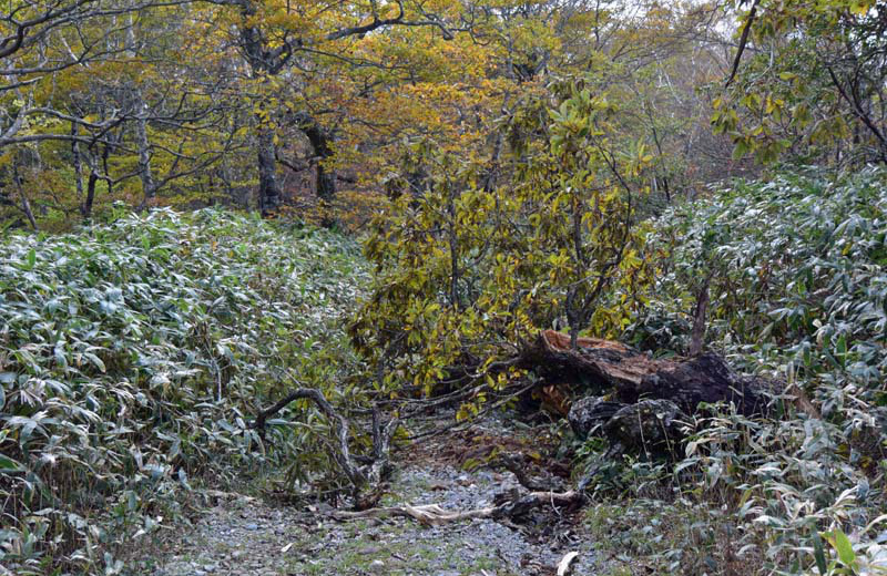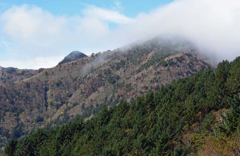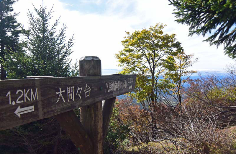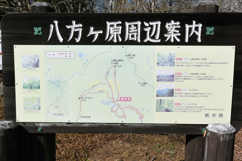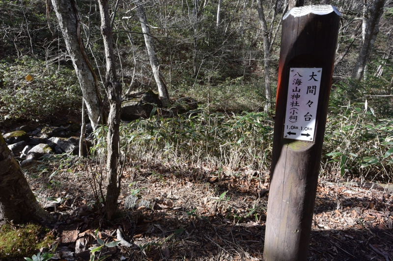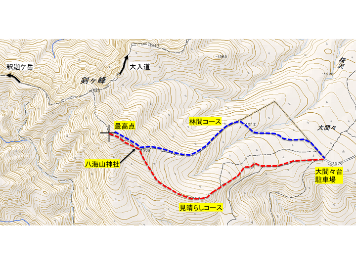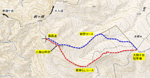 <登り(赤線):1時間30分> 大間々駐車場 :10:45出発 登山口(見晴らしコース) あああああああああ:10:56通過 八海山神社 ;12:00通過 最高点 (1590m);12:15着 あ <下り(青線);1時間> 八海山神社 ;12:50出発 中間地点 :13:23通過 大間々駐車場 :13:50着 |