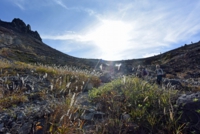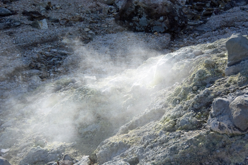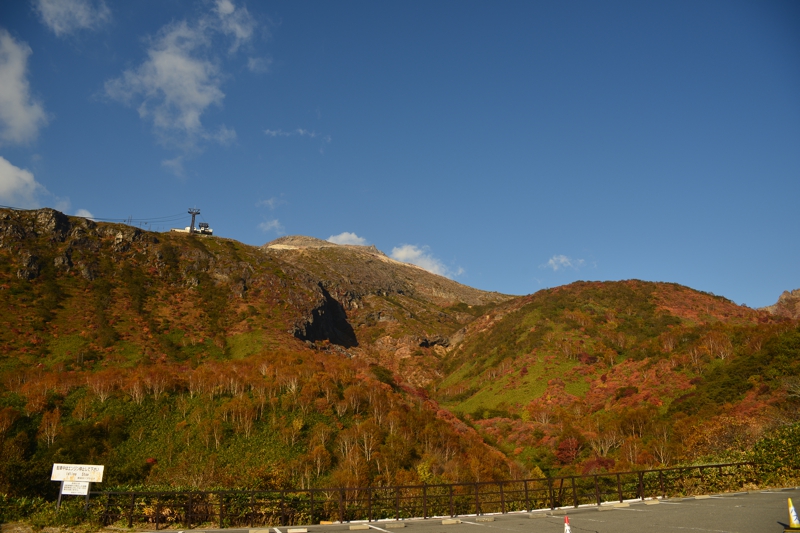 ロープウェイ山麓駅周辺の駐車場に車をとめた。やはり3連休の影響かな。登る時は長袖Tシャツ2枚で、