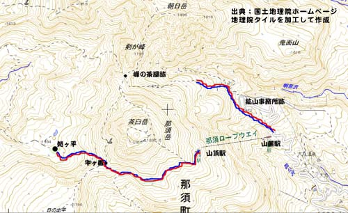 この日は風が強くロープウエイが動かないため、鉱山事務所跡から峠の茶屋経由で牛ヶ首へ出る