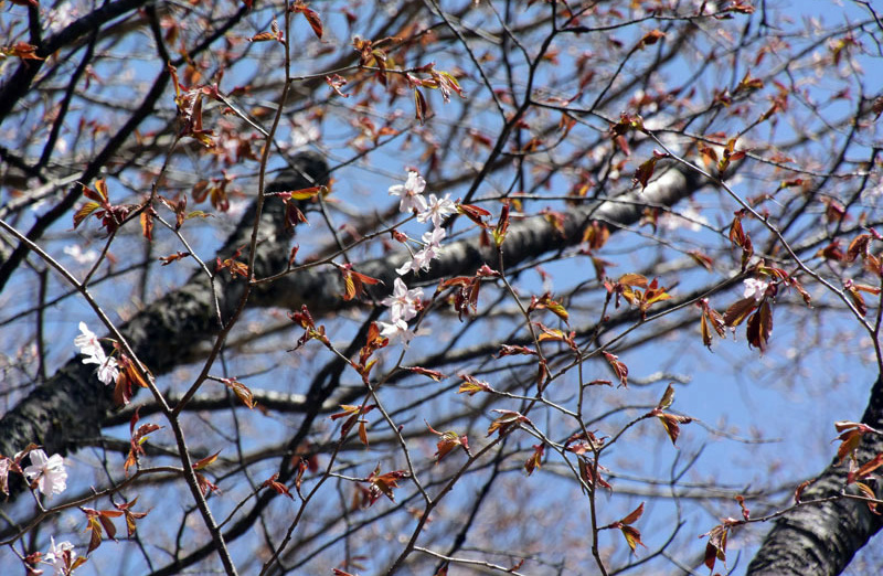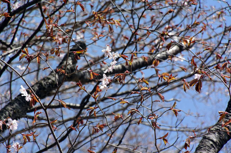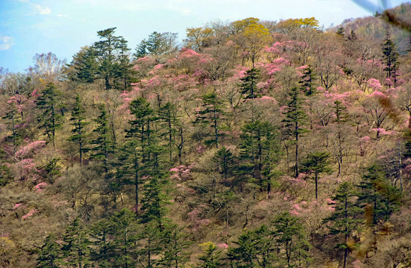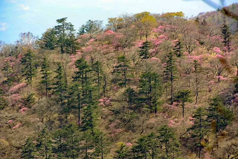 八海山神社で遅い昼食をとり、見晴らしコースで大間々駐車場へ降りる途中、「ミツモチ山」の方でアカヤシオが満開になっていた。