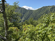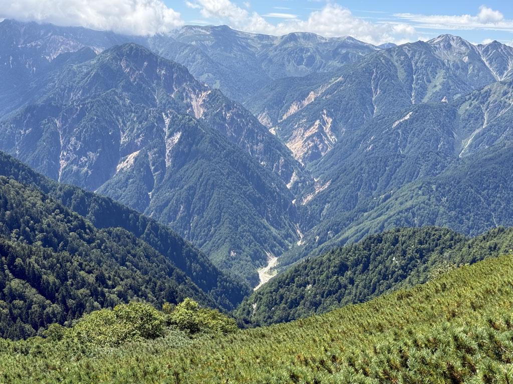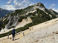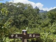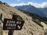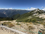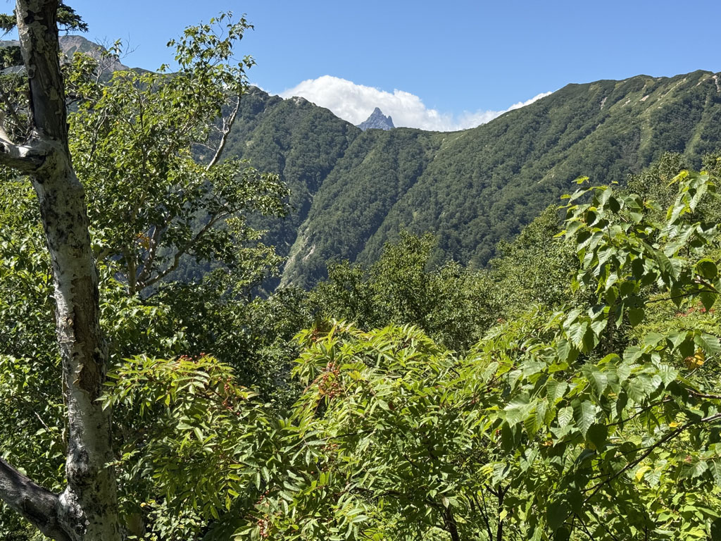 陽射しがキツくなってきた。そろそろ「槍ヶ岳」が見えるころと思いつつ左側を気にしていたところ、遠くに独特の山容の「槍ヶ岳」が見え